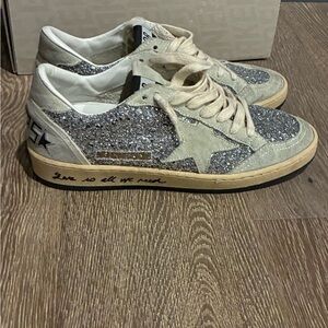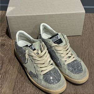Chic sneakers with sparkling silver glitter and star accents. Ideal for a fashionable touch.