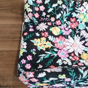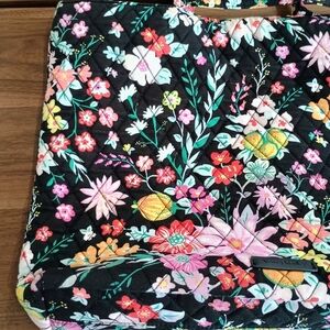 Charming tote with vibrant floral design. Features multicolor flowers on a black background. Ideal for daily use.