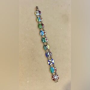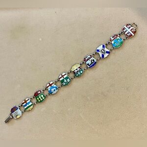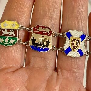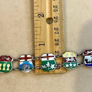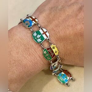 Very cool Canadian bracelet. Colorful Enamel, sterling silver. Each piece is marked with the name such as Alberta and Sterling BMCO. The panel closest to the end in addition is also marked Made in Canada. It’s slightly bigger than a 7”. The last pic shows a little discoloration on one of the panels. Fold over clasp, weighs 21.09 grams.