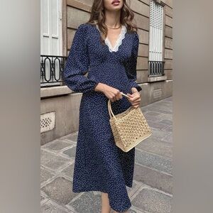 Elegant navy dress with white polka dots. Features a lace trim neckline and long sleeves.