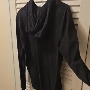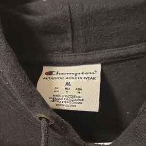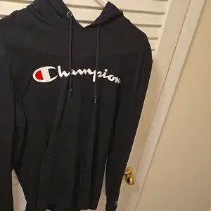 Stylish black hoodie with front pocket Champion logo. Comfortable and casual.
