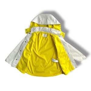 This Zara raincoat combines a bright yellow interior with a sleek white exterior, offering a stylish and functional option for rainy days. Crafted from water-resistant material, it features a hood for added protection and a relaxed fit for comfort.