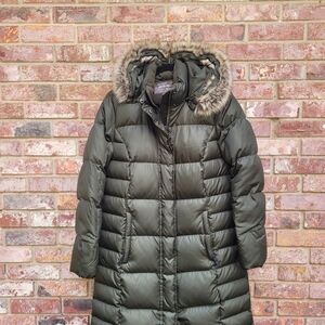 Eddie Bauer Lodge Dark Green Hooded Down Duffle Coat with Faux Fur Trim