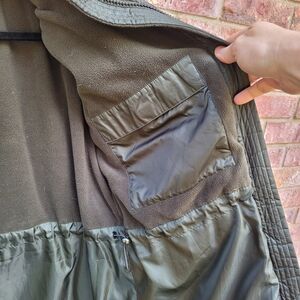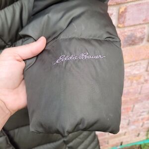 Eddie Bauer Lodge coat in a classic dark green. Excellent used condition. This is a super light and warm down coat that extends below the knee. The faux fur trim around the collar will keep you extra warm, but it snaps off if you don't want it, or you can zip off the entire hood. Top half has fleece lining. This is an amazing coat but I live in Texas, and let's be real, I'm never going to use it! Great for colder climates or ski trips. Please examine the photos carefully and let me know if you have any questions.