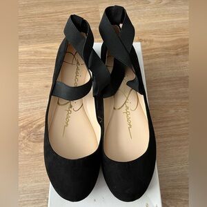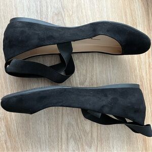 Elegant black flats with comfortable elastic straps. Perfect for everyday wear.