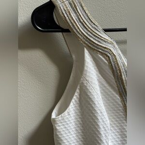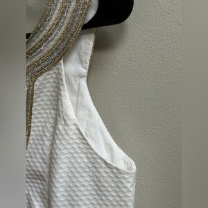• Features: Notched neckline, metallic soutache trim, sleeveless, back scoop, fully lined, fitted silhouette