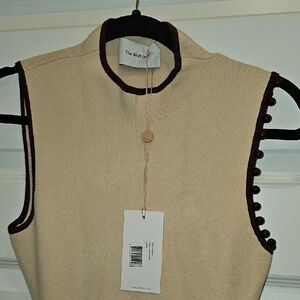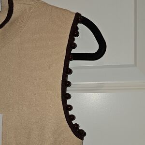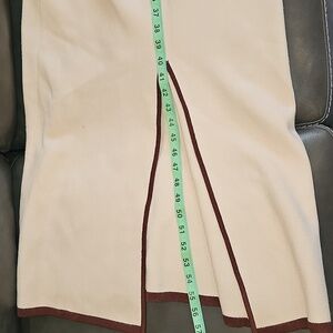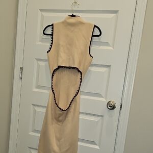 This chic cream midi dress features elegant brown trim, offering a stylish and modern look. Perfect for any occasion.