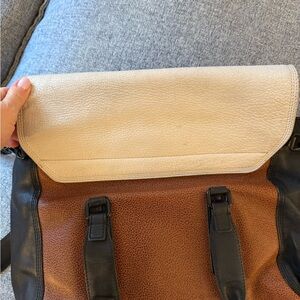 Elevate your style with this sophisticated bag. Crafted in elegant black and brown leather, it's perfect for any occasion. Durable and stylish, this bag is a must-have accessory. It is VERY USED. It was the IT girl bag of my younger NYC days - great bag