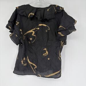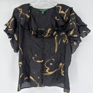 Elevate your style with this stunning two-piece set from Lauren Ralph Lauren. This elegant ensemble includes a silk blouse and matching skirt, both crafted from 100% luxurious silk. The striking black base is beautifully accented with abstract gold brushstroke detailing, adding a touch of artistic flair and subtle shine.