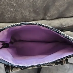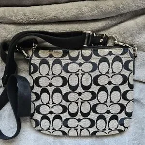 Coach crossbody with signature pattern. Features a front pocket and adjustable strap. Black leather trim and silver hardware. Lave der satin lining inside, needs cleaning. Ideal for daily wear. Measures 7 x 8 1/2 inches.