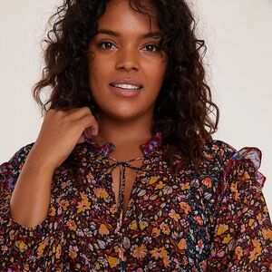 This dress is SO GOOD! Pair with a tank and some jeans for a boho look or add a black slip dress under it to dress it up. Love the print & colors! Ruffled touches and a flowy silhouette make this dress a staple.
