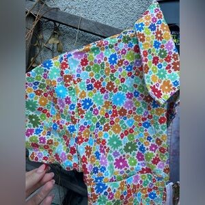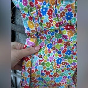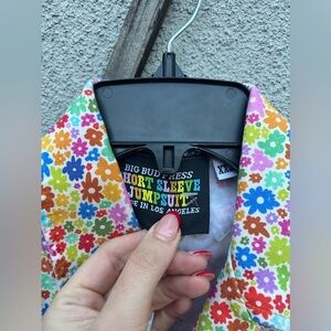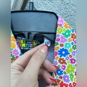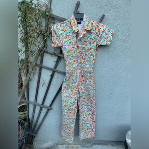 Introducing a limited edition Big Bud Press jumpsuit in a vibrant rainbow blossom floral pattern, perfect for any occasion. This comfortable and stylish one-piece features a collared neckline, button closure, and an elastic waist for a flattering fit. The jumpsuit is made of high-quality cotton twill fabric and is machine washable for easy care