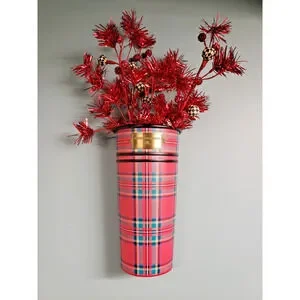 MacKenzie-Childs metal wall container, decorated with decaled red tartan and the distinctive logo plate, is the perfect traditional touch for the holidays, especially when filled with everlasting greenery