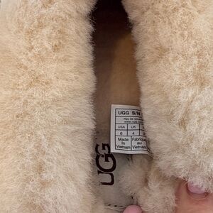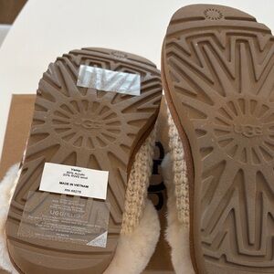 Warm UGG slippers with a textured cream knit. Plush tan lining for ultimate comfort.