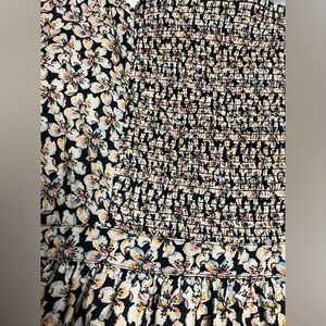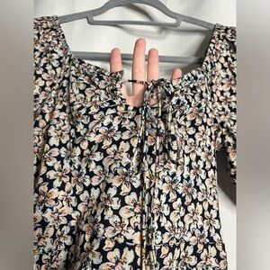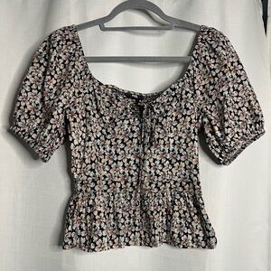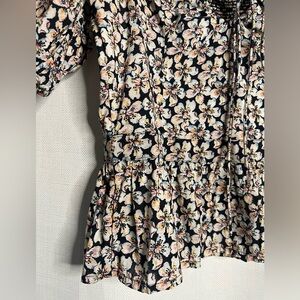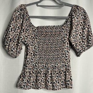 PAIGE Azul Floral Blouse. Flaunt your feminine flair in this cute Paige Azul Top with keyhole self-tie detail on the front. Made from a breathable and lightweight cotton blend. Pullover style. Halter neck detail and keyhole at the center front with ruching. Half-length puff sleeves. Smocking panel at the back. Straight peplum hem. Allover Hawaiian floral print. 55% cotton, 45% Modal. Size XS.