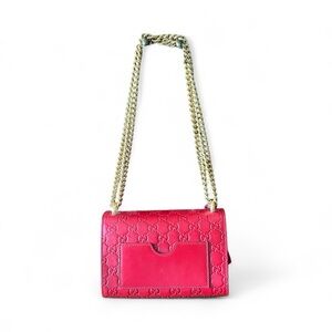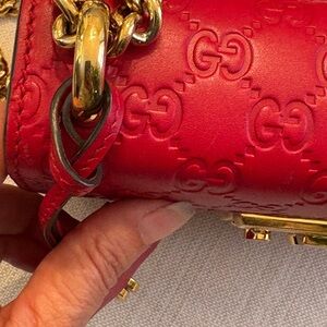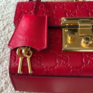 Chic Gucci crossbody bag in vibrant red. Features a luxurious gold chain strap and secure lock closure. Perfect for elevating any outfit. This bag includes care cards and dust bag. 100% original it is a pre loved Item base some miner catches and fading on the hardware and leather. Please check pictures for references.