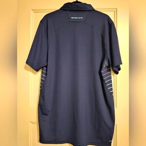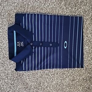 Beautiful Navy and Aqua Blue Striped Three Button Collared Polo Shirt with the Oakley Logo on the Mid Chest Area and the Oakley Name on the Upper Back. Breathable Polyester Fabric and in Excellent Condition.