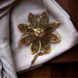 Vintage Arthur Pepper enamel flower brooch. It is gold tone with white petals and smaller orange and yellow flowers. Signed ART on the back. There are normal vintage wear to it. Please refer to pictures.