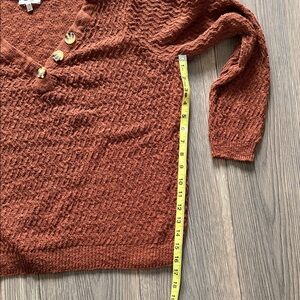 Textured rust sweater with elegant button details. Ideal for layering and comfort.