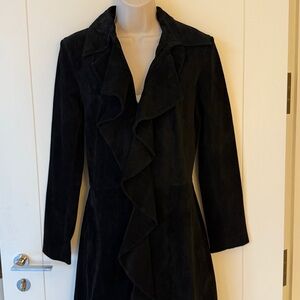 Black suede vintage Margaret Godfrey ruffle front topper duster coat - black suede - long sleeves - collar w/ruffle trim from under collar all the way down front - 3 large hook & eye closures down front - two front slit pockets - just below knee length - fully lined in black 100% polyester - bohemian chic - excellent vintage condition - from my own closet & worn only once or twice - typical variations to the suede but no stains or damage - size 6 - measures approximately 18" underarm to underarm across front - 16 1/8" side to side across front at waist -15 7/8" shoulder seam to shoulder seam - 24" shoulder seam to cuff - 39 5/8" neck seam to hem down center back - 32 1/4"underarm to hem down side