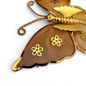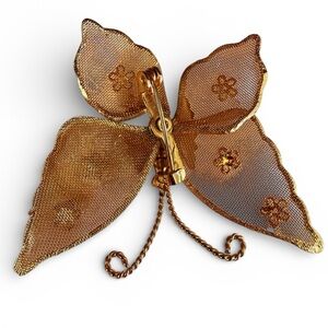 vintage butterfly brooch, gold tone brooch, mesh butterfly pin, floral brooch, mid century jewelry, vintage pin, unsigned brooch, gold mesh jewelry, butterfly jewelry, floral accent pin, c‑clasp brooch, vintage costume jewelry, garden motif brooch, collectible brooch, statement pin, whimsical brooch, insect jewelry, vintage accessory, giftable jewelry, feminine brooch, antique gold tone, brushed gold tone