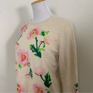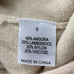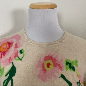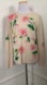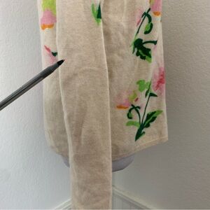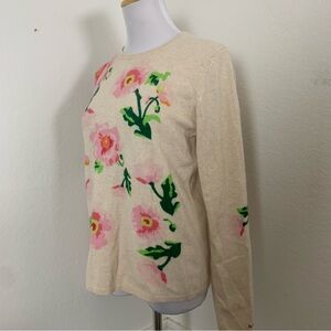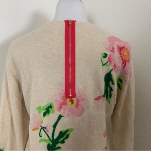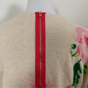 Size small. 40% angora. Very soft. Back zip closure. Oatmeal/cream color with beautiful pink flowers. Good preowned condition. A few very fain spots on back of one arm, so fain they are difficult to show in pics. Measured flat. Armpit to Armpit is 18.5”, shoulder to bottom hem is 24”. Free of holes.