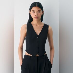 This is a button-up V-neck vest with a slim fit and princess seams for shaping. It’s made with Crepette™ — a one-of-a-kind Japanese crepe fabric beloved for its subtle texture, breezy drape and the fact that it basically never wrinkles.