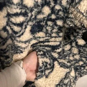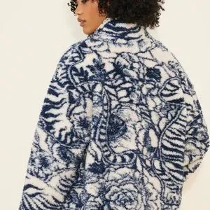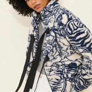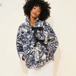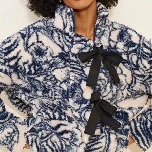Stay warm and stylish with this navy and cream teddy jacket, featuring elegant bow details. Perfect for adding a touch of sophistication to your wardrobe.