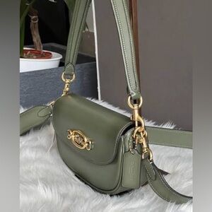 NWT, brand new never used, no scratches still has tags attached. Elevate your style with this elegant Coach shoulder bag. Crafted in a sophisticated olive green, it features a sleek design perfect for any occasion. The gold accents add a touch of luxury, making it a must-have accessory.