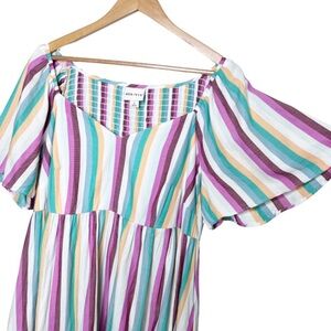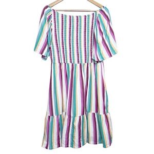 Ava + Viv striped midi dress with a vibrant multicolor pattern. Features a square neckline with smocking detail on the bodice, short flutter sleeves, and a tiered, ruffled hemline. Side pockets add practicality. The empire waist design flows into a relaxed skirt. Size 0X. 100% Cotton. Machine wash cold. Made in Vietnam.