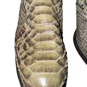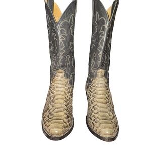 Authentic Justin western cowboy boots crafted in genuine python snake skin with classic stitched leather shaft. Made in USA with leather soles and stacked heel.