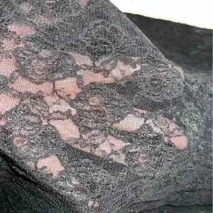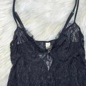 Absolutely beautiful and sexy lace sheer babydoll. Cups have underwire but no padding. Fuller skirted with stacked ruffle bottom hem. Adjustable straps and back band is stretchy. Pull on style. No flaws.