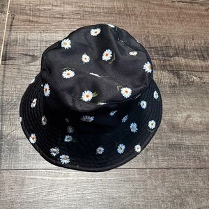 Stylish black bucket hat with daisy print. Perfect for casual outings.