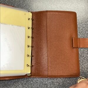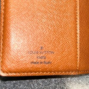 Agenda is covered in brown LV monogram. Can be used as a small wallet and passport holder. Great used condition. Interior has 3 credit card slots with 1 slip pocket under the card slots. 1 larger slot on opposite can hold a passport.