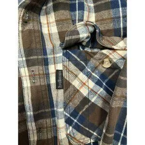 This flannel shirt features a classic plaid pattern in brown and blue tones. It's made with durable fabric, offering style and comfort for casual wear.