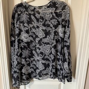 100% silk classic billowy witchy blouse in a black based paisley floral print , size small