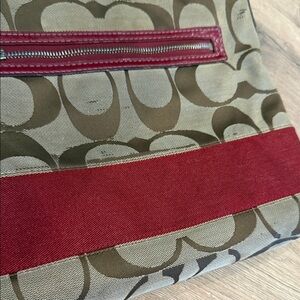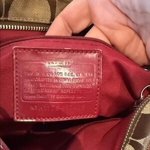 Stylish Coach crossbody with signature pattern. Features tan and red design. Perfect for everyday use.