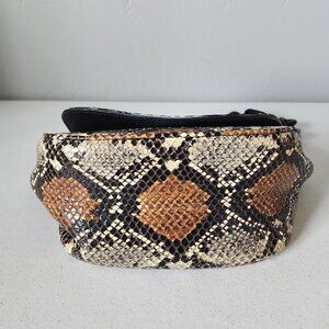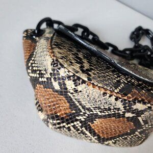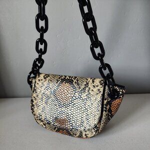 "EUC" Super Cute Snake Print Leather Small Bend Shoulder Bag By Simon Miller. Flap Magnetic Snap Closure, Logo Embossed Leather on Front Flap, Clean Leather Interior / No Pockets, Acrylic Over Sized Chain Strap/Handle with 11" Drop, Bag Measures approx. 6" T X 12" W/Across Top, X 4" D, Excellent Used Condition, No Wearing/Corners/Stains, Minor Markings Normal/Interior, Light Use:) Rt.590.00 approx.