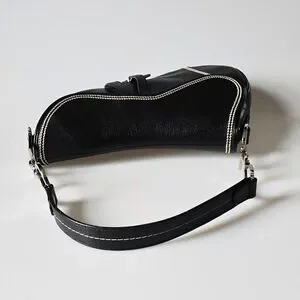 This vintage Dior saddle bag by John Galliano from 2005 features a full shiny black goatskin leather body with an edgy off-white contrast stitching detail. Measuring around 9.5"W x 8"H x 2"D, it offers plenty of space for your everyday items on-the-go and holds them securely with a velcro leather strap closure that features Dior's iconic D charm in silver.