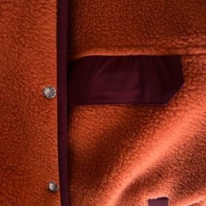 Cozy fleece jacket with snap buttons. Features a high collar and front velcro pocket. Relaxed fit.
