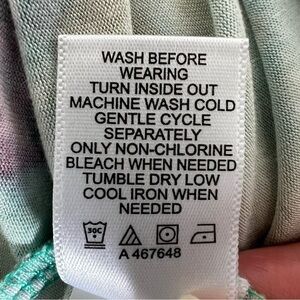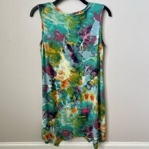 LOGO Lori Goldstein Watercolor Artsy Tank Top Shark Bite Hem Stretch Multicolor XS - in excellent used condition. When laid flat, top measures approximately 18 inches from pit to pit and 34 inches long.