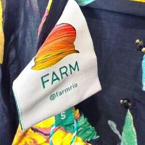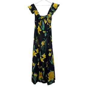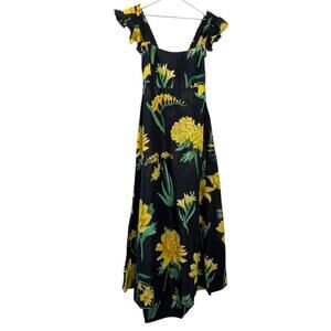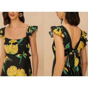 Farm Rio Alice Flowers Black Maxi Dress Yellow Floral Flutter Sleeve Size S
