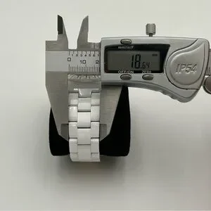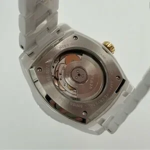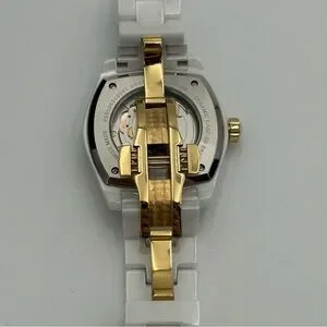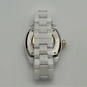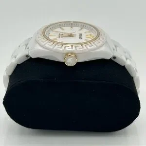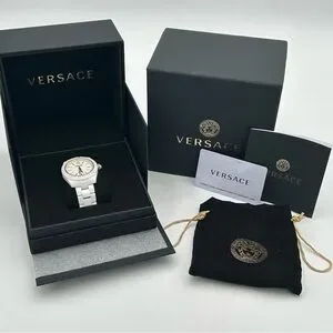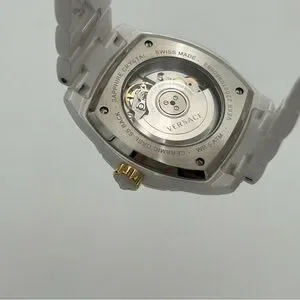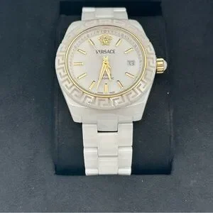 18 mm white and gold Versace mechanical watch in new condition. Comes with original watch, authenticity card, and care kit. Approximately 7.25” around. Extra links included!