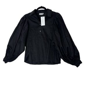 The Harshman Lois Popover Dress Shirt Top in size XS is a stylish and versatile addition to any wardrobe. Made from 100% cotton poplin, this black top features a collared neckline, long puff sleeves with pleats and buttons, and a relaxed fit. Ideal for various occasions including workwear, this top can easily be dressed up or down in a sleek, elegant style. Perfect for all seasons, the lightweight and breathable fabric make it a comfortable and chic choice for any time of year.