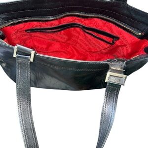 This chic and roomy Ellen Tracy leather tote is perfect for everyday elegance. Featuring a smooth black leather exterior, dual shoulder straps, and a bold red interior lined with repeating “ELLEN TRACY” logo. Well-organized with a zippered interior pocket and slip compartments—ideal for your essentials. Versatile enough for work, travel, or casual outings.