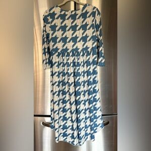 Chic women’s Nuggles teal and white houndstooth top with a high-low design. Ideal for versatile styling. Like NEW condition!!! Only worn twice. No call outs. It has 3/4 sleeves and it has some pleating across the back. Size medium.