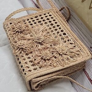 Hand made straw flowers on front with crossbody strap.