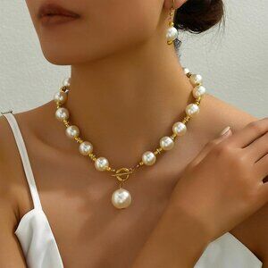 Chunky Pearl Necklace Set for Women Gold Pearl Choker Earrings Jewelry