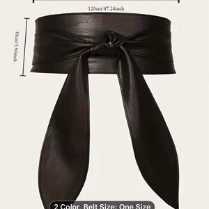 This item is a black faux leather wrap belt, often referred to as an obi belt or a tie-waist belt. It features a wide, soft design that can be tied around the waist in a bow shape to cinch a dress, tunic, or coat.