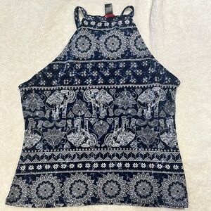 Stylish navy blue halter top featuring an intricate elephant print. Perfect for casual outings and summer days.